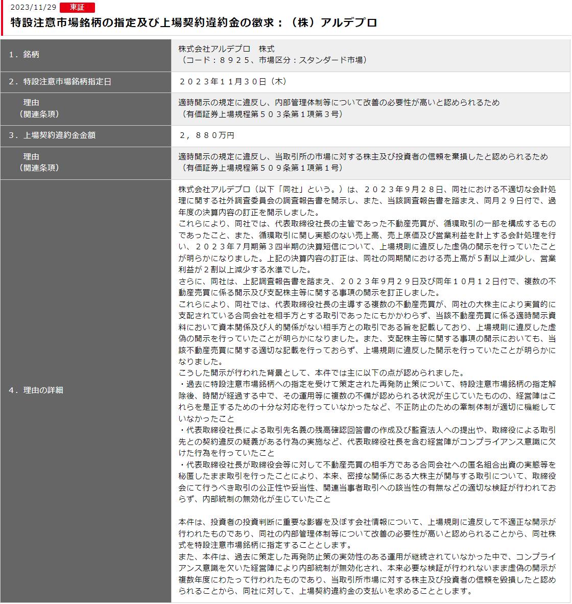 適時開示の規則に違反し、内部管理体制等について改善の必要性が高いと認められるためとしている。上場契約違約金金額は2880万円。
