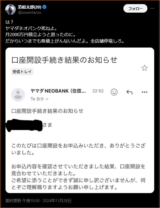 造船太郎さん、MEGABIGで2億当選したのにヤマダネオバンクの口座審査落ち(´・ω・`)