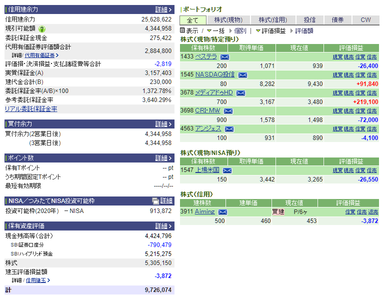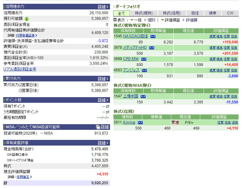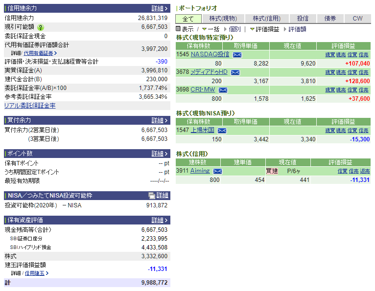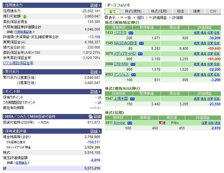 今日はエイミングを追加、騰ったメディアドゥはほぼ利確