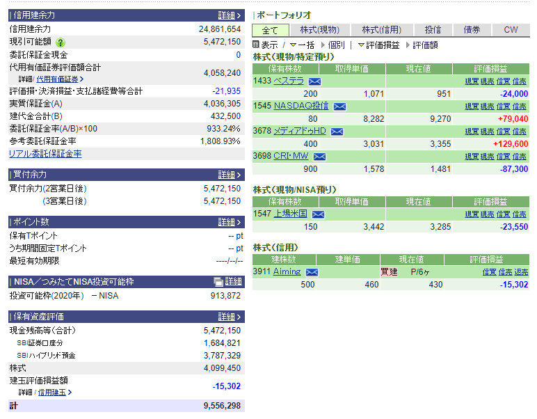 保有株だと終値ベースではエイミングが大きく上げた